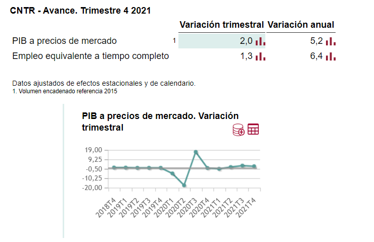 Si comparamos con el mismo trimestre del año anterior, tenemos que la variación del PIB respecto del cuarto trimestre del 2020 ha aumentado un 5,2% siendo la tasa de variación del PIB anual positiva, lo que significa crecimiento.