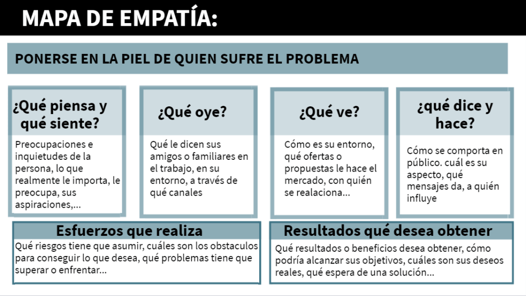 Esta última parte es fundamental para definir propuestas de valor ajustadas, ya que conecta directamente los puntos de dolor del cliente con los beneficios que espera recibir. Así, el mapa de empatía no solo permite comprender al cliente, sino también orientar el diseño del producto, el mensaje de marketing y la comunicación hacia lo que realmente necesita.