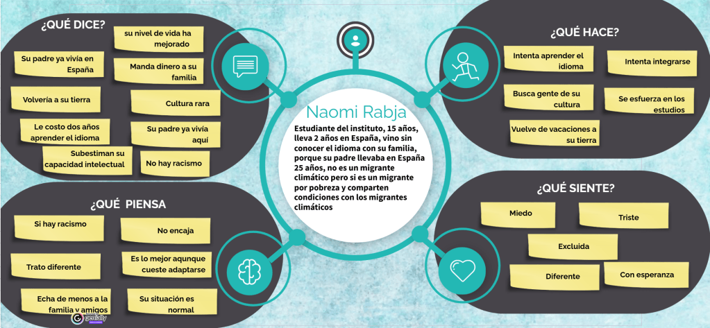 El siguiente mapa de Empatía se hizo en 1º de Bachillerato poniéndose el alumnado en la piel de una alumna inmigrante del instituto: