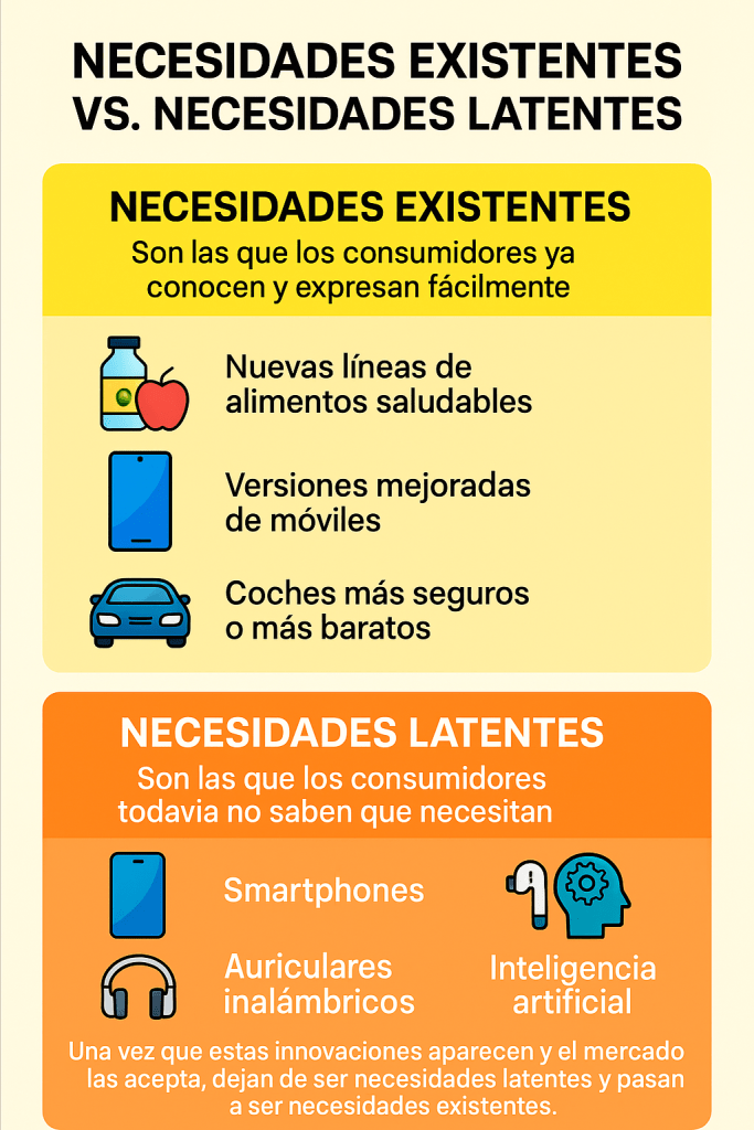 Existe una diferencia sobre si un producto o servicio sirve a necesidades existentes o latentes. Es más fácil que respondamos a una necesidad existente, que a una latente, ya que, la primera responde a un mercado que existe y la otra a un mercado que hay que crear.