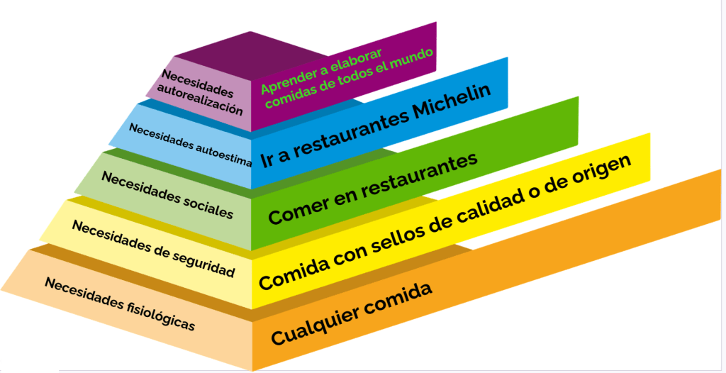 La imagen muestra cómo la teoría de las necesidades de Maslow puede trasladarse al ámbito de la alimentación y el comportamiento del consumidor. Cada nivel de la pirámide representa un tipo de necesidad humana y cómo esta se refleja en las decisiones de compra relacionadas con la comida: