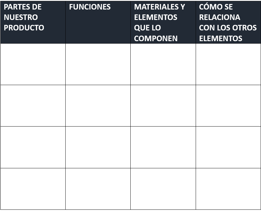 Empezaremos indicando las distintas partes que componen nuestro producto o servicio y qué función va a tener dentro del global.
