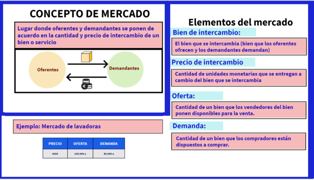 El mercado es el lugar o institución (no tiene por qué ser físico), donde los oferentes o las empresas que venden un producto y los demandantes o aquellos particulares o empresas que están dispuestas a comprar un producto a un precio determinado, se ponen de acuerdo en la cantidad de producto a intercambiar y el precio de intercambio.