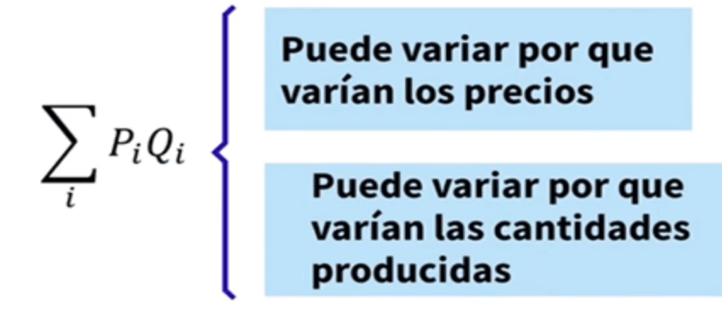El PIB o el sumatorio anterior puede variar, o bien porque varían los precios, o bien porque varía la cantidad producida, o bien porque varían ambos.