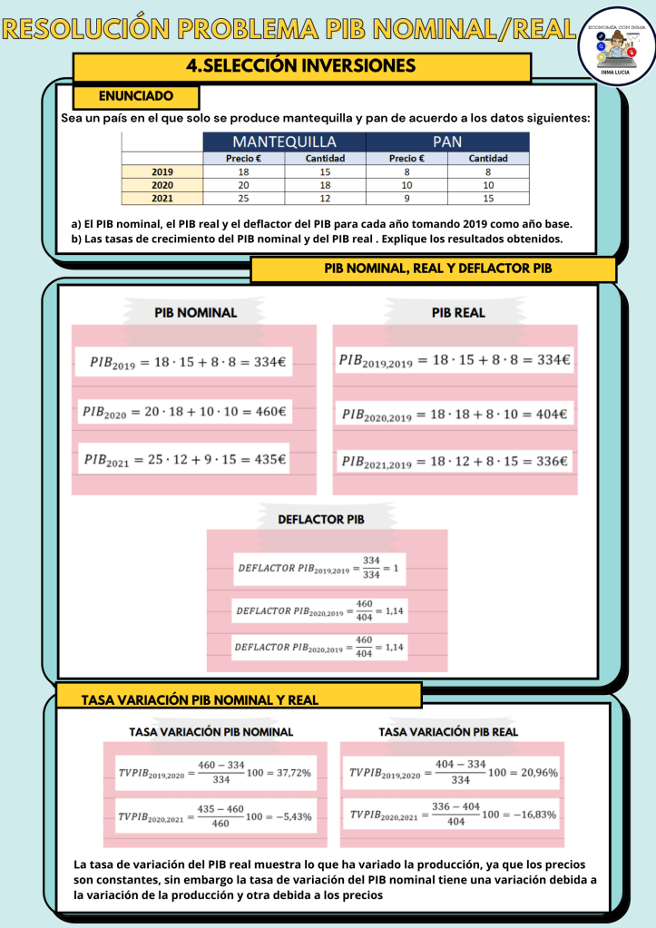 En la siguiente infografía tienes otro problema resuelto de PIB nominal, PIB real y deflactor del PIB.