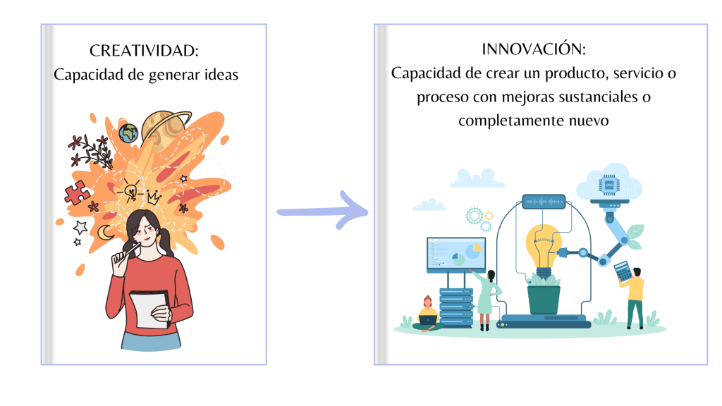 Pero se puede ser muy creativo, tener muchas ideas y no ser capaces de innovar, ya que el proceso de innovación requiere además de creatividad para buscar mejoras y novedades, ser capaces de llevar esas ideas a cabo produciendo productos o procesos mejorados o completamente disruptivos.