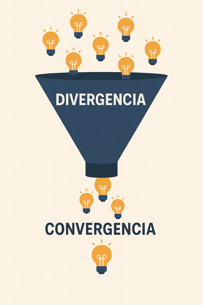 En esta fase, el objetivo es abrir la mente. Se generan numerosas propuestas sin juzgarlas. Cuantas más ideas, mejor. En esta etapa no existen ideas malas y toda aportación suma.