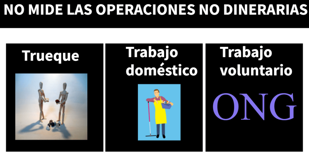 - Las operaciones no dinerarias, es decir, operaciones como el trueque o como el trabajo doméstico o como el trabajo voluntario, por ejemplo, que se realiza en asociaciones o en una ONG.