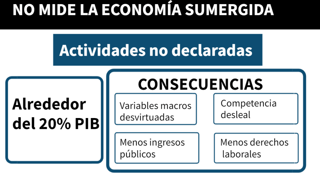 - La economía sumergida, es decir, las actividades que no han sido declaradas, y que en España se estima que son alrededor del 20 por ciento del PIB, teniendo consecuencias negativas, tales como: