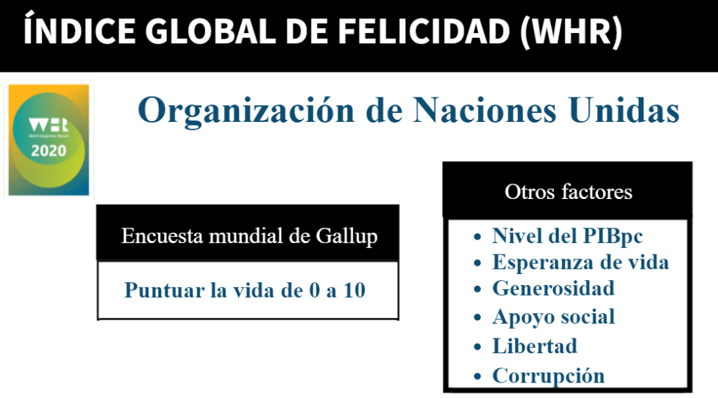 Un tercer indicador es el Índice global de felicidad que lo elabora la Organización de las Naciones Unidas en el informe mundial de la Felicidad.