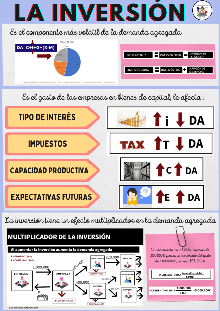 - El tipo de interés, si el tipo de interés aumenta, la inversión disminuye, porque las empresas van a pedir menos préstamos al ser más caros, como muchas inversiones se hacen vía préstamos, la inversión disminuirá.