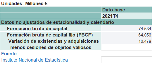 Si miramos los datos de la contabilidad nacional del 4º trimestre en 2021, tenemos por un lado la formación bruta de capital o inversión total, que está formada por la suma de la formación bruta de capital fijo o la inversión fija más la variación de existencias que al ser positiva significa que se ha gastado todo lo que había almacenado más parte de las existencias compradas por las empresas.