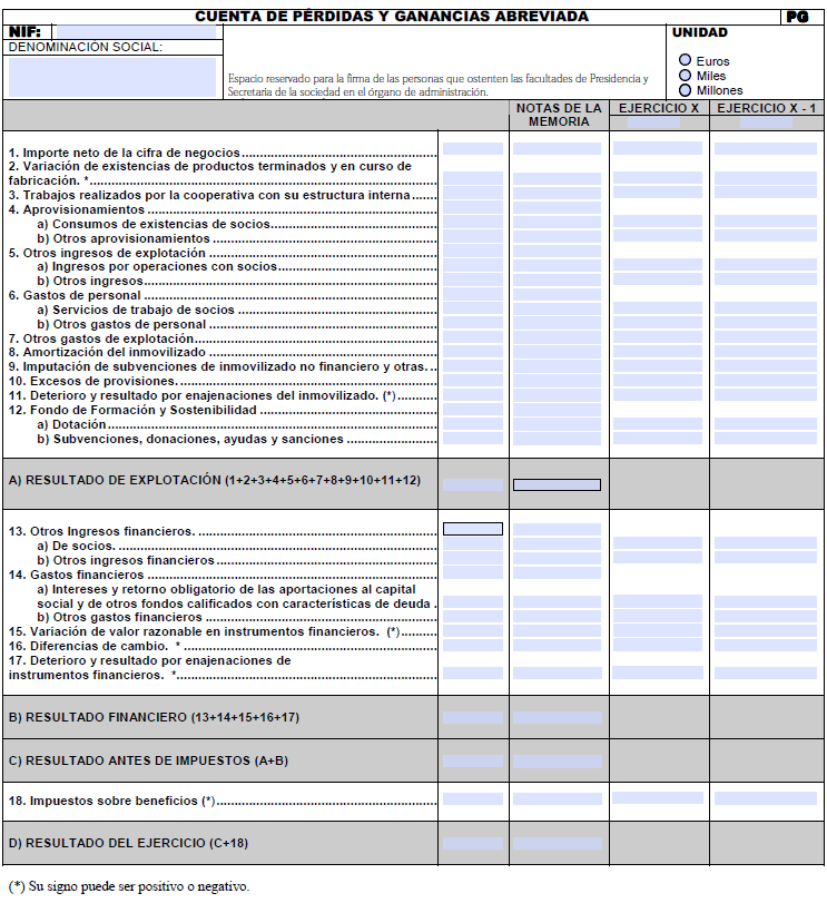 Al igual que en el balance, hay que mostrar los datos de los dos últimos ejercicios