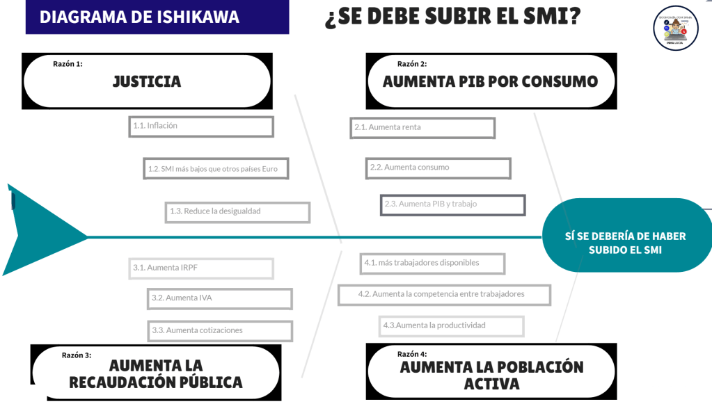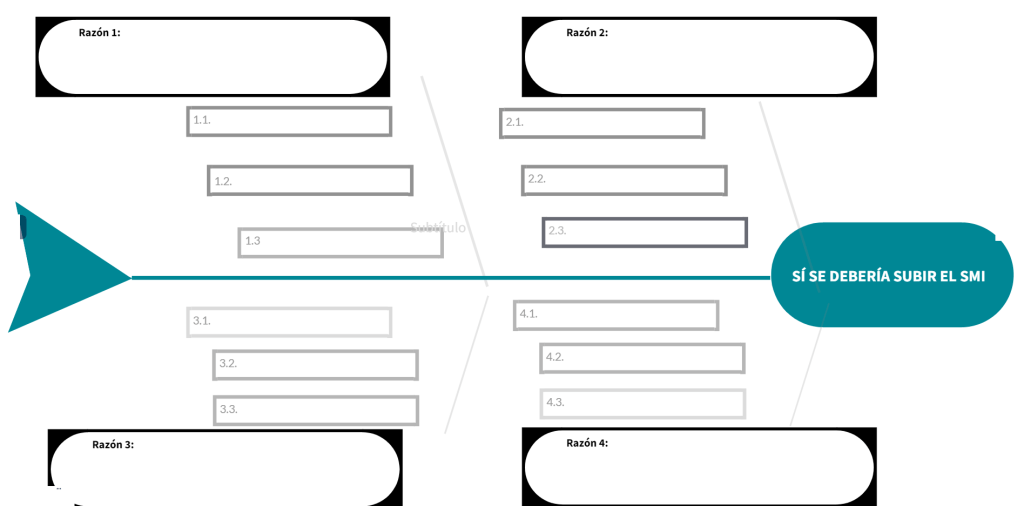 En la cabeza del pez se debe poner la tesis que se está defendiendo o la conclusión a la que queremos llegar, por ejemplo si el debate es: «¿Se debería subir el SMI?», el siguiente diagrama de pez nos permitirá sacar los argumentos de la postura a favor: «SI SE DEBERÍA DE SUBIR EL SMI»
