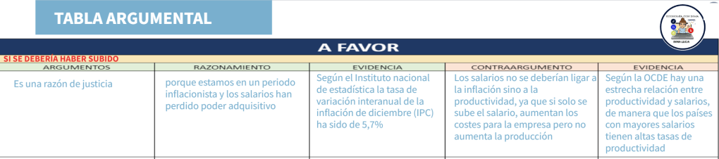 La tabla argumental al igual que el ISHIKAWA se debe de hacer para las dos posturas y cómo veremos algunas de las refutaciones de un argumento nos servirán como argumentos en la otra postura, además de ayudarnos a plantearnos preguntas que el equipo contrario podría hacer.