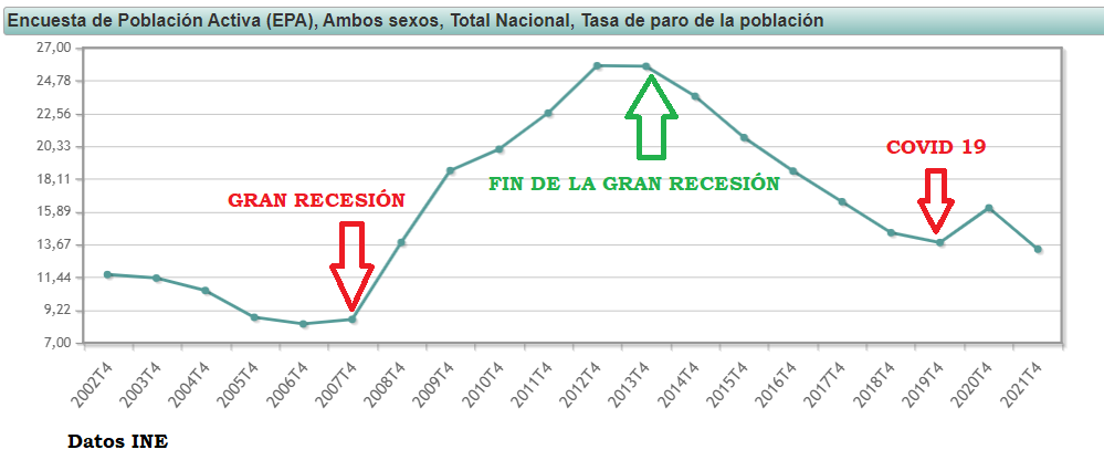 De 2002 a 2008 la economía estaba en crecimiento, el paro se situaba bajo y decreciente, hasta la crisis de las hipotecas subprime, también conocida como gran recesión en septiembre de 2008, a partir de ahí el paro empieza a subir y dura hasta que la economía empieza a crecer, generándose trabajos, lo que ocurre en 2013.