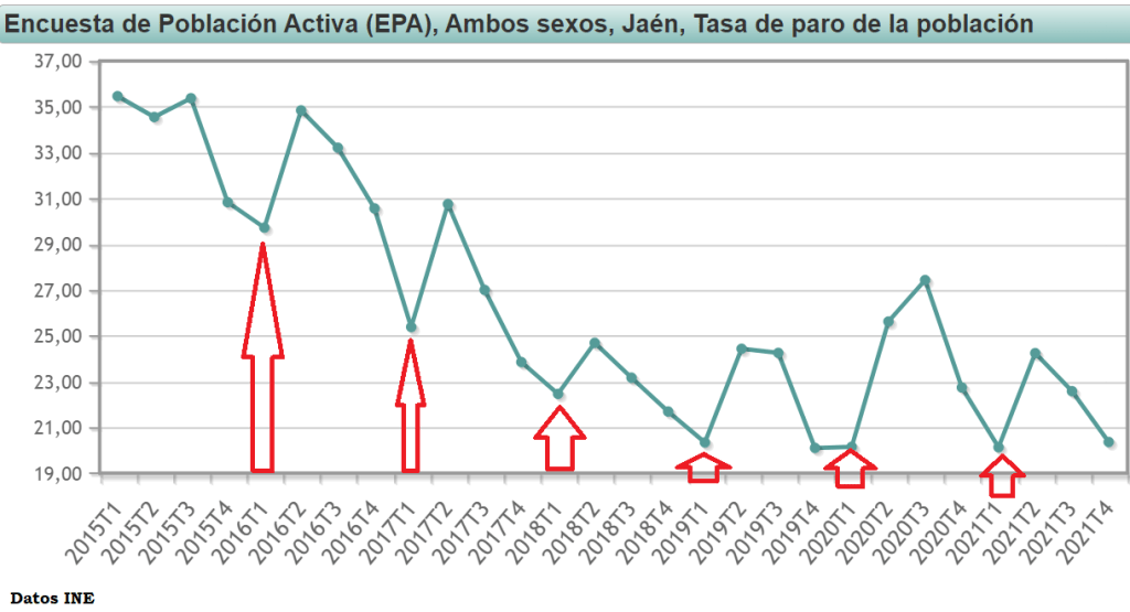 Como vemos señalado con las flechas rojas entre el primer y el segundo trimestre siempre aumenta el paro, lo que es debido al fin de la temporada de aceituna que suele darse en febrero aproximadamente, esta subida del paro en ese trimestre es lo que se considera paro estacional.