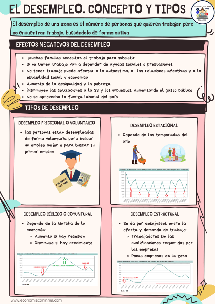 En este apartado vamos a hablar del desempleo: Qué se entiende por desempleo, Qué efectos negativos tiene tener un nivel elevado de desempleo y qué tipos de desempleo existen.
