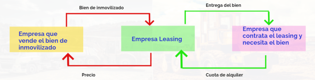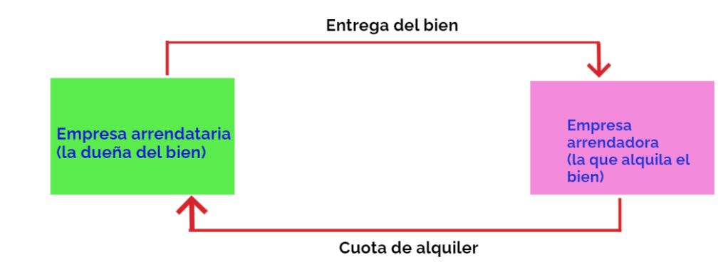 Una empresa compra el bien de inmovilizado que una empresa necesita y se lo alquila a la empresa que lo necesita a cambio de una cuota periódica, al cabo del plazo estipulado en el contrato, tiene la opción de comprar el bien por el valor residual, o no comprarlo.