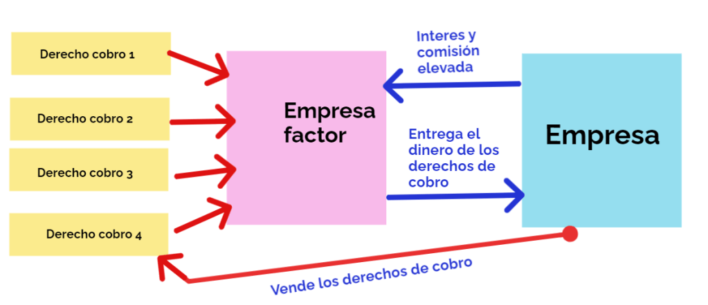 Una empresa compra los derechos de cobro de una empresa, es decir dinero que le deben a la empresa, cobrando por ello una alta comisión y asumiendo la empresa factor el riesgo de impago.
