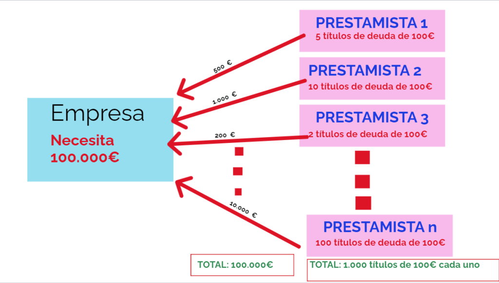 La empresa que recibe la financiación se compromete a devolver el dinero prestado a cada uno de los prestamistas en el plazo estipulado con los intereses pactados.