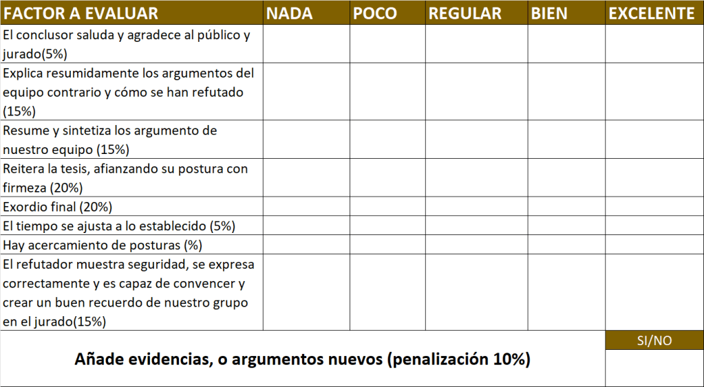 El conclusor debe resumir lo acontecido en el debate, sin aportar nuevos argumentos o evidencias, ni refutar al equipo contrario, es decir no puede aportar nuevos datos.
