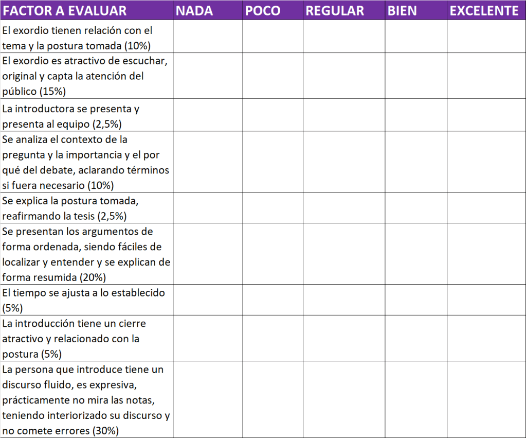 El introductor como la propia palabra indica va a presentar la postura de su equipo en el debate. La estructura de una introducción puede seguir el siguiente esquema:
