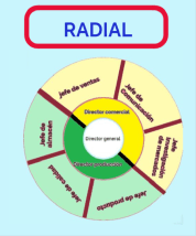 Sin embargo, con un organigrama radial, se pretende generar un impacto visual, se situarán las relaciones de autoridad de dentro a afuera, en la imagen superior se puede ver en amarillo el departamento comercial, formado a su vez por tres subdepartamentos y el departamento de producción en verde formado a su vez por otros tres subdepartamentos.