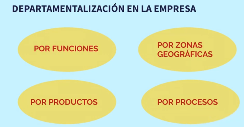 - Departamentalización por funciones: los trabajadores se van a dividir según su especialización, o por el tipo de trabajo que van a realizar, siendo los más comunes el departamento comercial, de producción , de finanzas, de contabilidad y de recursos humanos, pudiendo a su vez dividirse cada departamento en subdepartamentos.