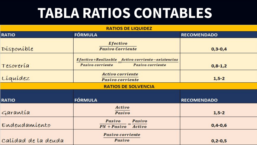 Se recomienda que se sitúe entre 1,5 y 2.Si es menor que 1 la empresa estaría en quiebra. Cuanto más próximo a 1 más cerca de la quiebra está la empresa.
