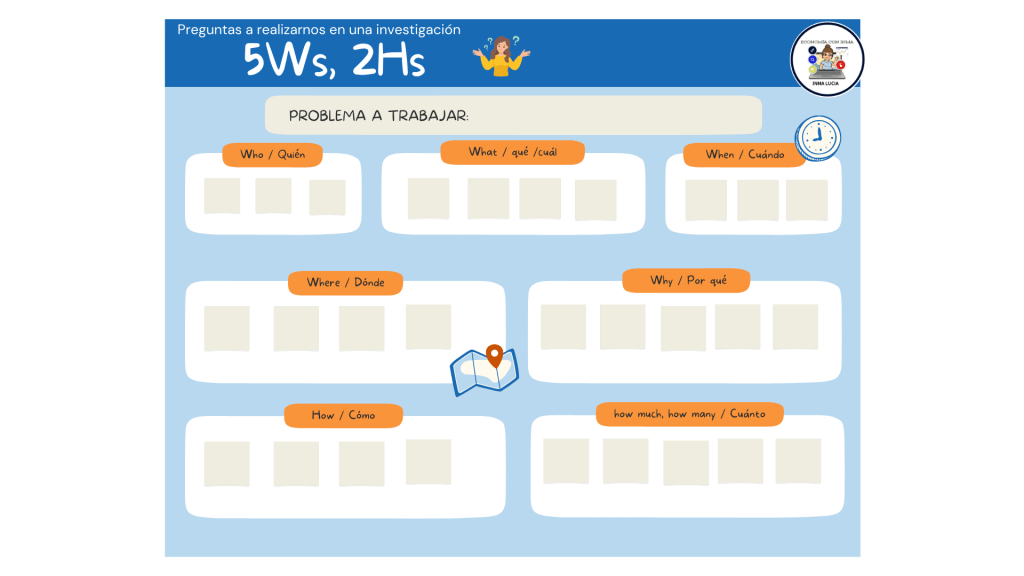 Para hacer las preguntas vamos a utilizar la técnica de las 5 W y las 2 H del periodismo que consiste en hacerse preguntas sobre el problema que empiecen por las 5 W’s y las 2 H’s (traducidas al español) y que puedes ver en la siguiente imagen para luego buscar sus respuestas