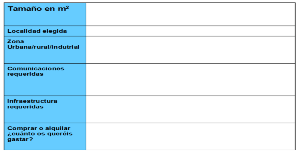Una vez que sabes que tipo de empresa vas a montar, y qué locales necesitas, vamos a ver las características de esos locales, para ello se va a rellenar una tabla como la que sigue: