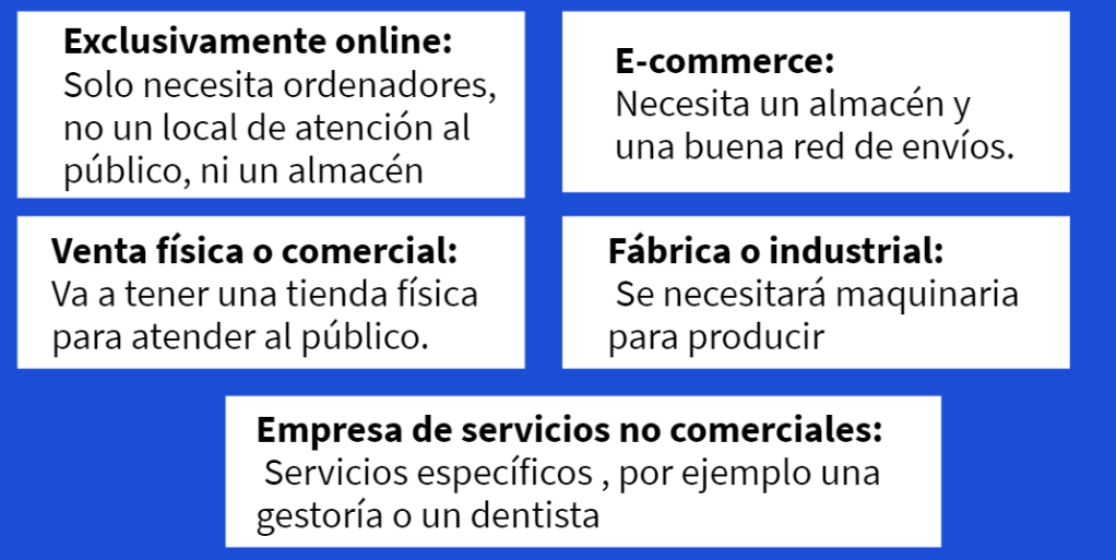 Para poder responder a estas preguntas en primer lugar responderemos a la pregunta ¿Qué tipo de empresa somos? Si pertenece a alguna de las empresas de la imagen, explica a cuál de ellas, sino explica las características de tu empresa y qué tipo de locales necesitas para llevarla a cabo.