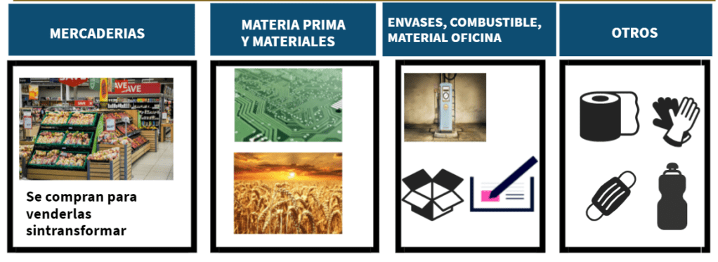 En este grupo se encuentran, la materia prima, los productos terminados, los productos que se compran para vender posteriormente, el combustible, los envases, el material de oficina entre otros.