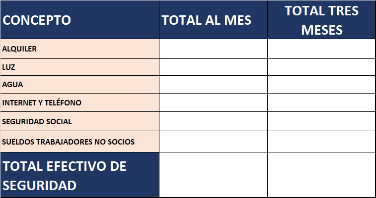 Se va a estimar que los tres primeros meses vamos a vender poco y por lo tanto nuestros ingresos no serán elevados y vamos a poner como tesorería de seguridad, el alquiler (si los locales son alquilados), los suministros, seguridad social, sueldos de trabajadores no socios de los tres primeros meses, en caso de que vayamos a pedir un préstamo también se pondrá la cuota a pagar de los primeros meses: