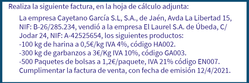 Como ejercicio de clase deberán realizar ejercicios sencillos de facturas, como el ejemplo siguiente: