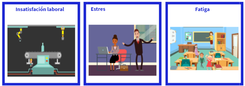 - Riesgos psicosociales: Aquellos factores de riesgo para la salud que se originan en la organización del trabajo: estrés, fatiga, acoso o mobbing laboral, pudiendo terminar en enfermedades graves como cuadros de ansiedad o depresión.