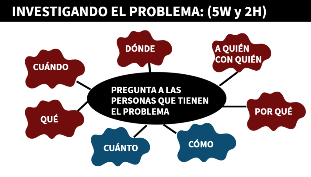 Para investigar el problema, vamos a empezar a preguntar a las personas que lo sufren, para ello diseñaremos preguntas usando las 5 W y las 2 H del periodismo que puedes ver en la siguiente imagen.
