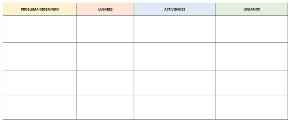 Vamos a empezar a buscar problemas centrándonos en el colegio, en la casa y en la calle o en otros ambientes, para ello vamos a observar dónde ocurre el problema, que actividades se están realizando cuando ocurre y qué personas o usuarios están implicados, para ello rellenaremos la siguiente tabla: